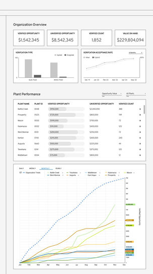 The wireframes plan out the full layout of the main organization level dashboard. The page is broken down into two (2) main sections, Organization Overview and Plant Performance.